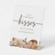 Dieses elegante "raten Sie, wie viele Küsse"-Podest-Schild besticht durch einen wunderschönen Rahmen aus handbemalten bohfarbigen Orange- und Terrakotta-Blätter, cremefarbenen und beigen Dahlien sowie wunderschönen rostfarbenen Rose auf weißem Hintergrund. Finden Sie passende Artikel in der Herbst Romance Brautparty Collection.