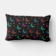 Ein Lumbalkissen, das mit einem eleganten Muster entworfen wurde, mit einer grafischen Abbildung von flatternden Schmetterlingen in vielen hellen Farben, die sehr schön auf dem schwarzen Hintergrund kontrastieren. Whimsikale Blumen, Zierspieße und Blätter verleihen dem Raum einen gewissen Charme.