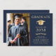 Elegante dunkelmarineblaue Uni-Abschluß-Ankündigung mit einem Foto des Absolventen, einem goldenen Gradmütze und ihrem Namen in klassischer Serifentypografie. Fügen Sie ihre Schule, Hauptfach, Ehren oder künftige Pläne.