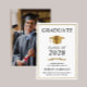 Elegante Uni-Abschluss-Ankündigung mit einem goldenen Gradmütze und schlichter moderner Typografie für den Namen, das Jahrgang der Absolventen, die Uni oder die Universität, den Abschluss und die Dur- oder Ehrendoktor. Das Foto des Absolventen füllt die Rückseite der Karte aus.