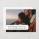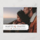 Moderne Vintage Foto Postkarte Hochzeit Speichern Sie das Datum. Das Design bietet Ihr Verlobung Foto mit einem eleganten Tab-Overlay und Platz für Ihren Hochzeitstag, Braut und Bräutigam vorne. Stilvolle Mischung aus traditioneller Schrift- und Schrifttypografie auf der Rückseite und ein trendiger, Vintager inspirierter Rahmen rund um die Adresse. Fügen Sie eine Nachricht oder mehr Informationen für Gäste in den Raum auf der Rückseite. Verwenden Sie die Entwurfswerkzeuge, um Schriftart anzupassen und Text zu verschieben, um ein eigenes einzigartiges, Save the Date gestaltetes Postkartendesign zu erstellen.