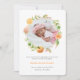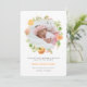 Elegante Blumenmeldekarte mit Blumenmuster in Aquarellfarben mit Blumenbildern aus orangefarbenen Zitrusfrüchten, rosa Lavendel und grünem Blattwerk vorne. Die Rückseite zeigt einen gelben Polka Punkt Hintergrund. Auf der Vorderseite ein Bild Ihres Neugeborenen, das auf dieser Karte hinzugefügt werden kann. Verwenden Sie ein Bild mit quadratischer Größe für eine einfache Anpassung. Die Karte weist runde Kanten auf. Perfekte Karte, um die Ankunft Ihres neuen Babys mit seinen Geburtsdaten anzukündigen. Ideal für Junge und Mädchen. Ideal für Sommer- und Frühjahrszeiten!