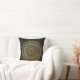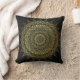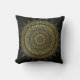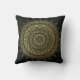 Ein wunderschönes, kreisförmiges Mandala-Kunstkissen in leuchtendem Gold auf weichem, schwarzem Hintergrund, inspiriert von mehndi Henna Körperkunst. Dieses meditative Design-Kissen verleiht Ihnen einen schönen Akzent auf Ihre Wohngestaltung.