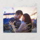 Diese hübsche Save the Date Postkarte bietet romantische Schrift und ein großes Foto. Auf der Vorderseite der Postkarte ist eine elegante Kalligrafie mit dem Aufdruck "Save the Date" in Gold geschrieben und überlagert ein landschaftlich orientiertes Foto. Die Namen des Paares, das Hochzeitstag und der Ort der Hochzeit sind in Weiß geschrieben. Fügen Sie auf der Rückseite der Postkarte weitere Details (wie z.B. eine Hochzeitswebsite) hinzu.