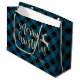 Modernes personalisiertes Merry Christmas Design mit eleganten Imitaten goldgeschriebenen Schriftzeichen, schönen Rentieren, schwarzen und blauen Büffel karierten Musterstück.