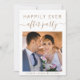 Elegante Einführung oder private Hochzeitsankündigung und Empfang Einladung. Die Vorderseite zeigt Ihr Foto "Happily Ever After Party" in einer Mischung aus einfacher Goldtypografie und einem schicken Goldskript mit Swashes, Ihren Namen und Ihrem Hochzeitstag. Auf der anderen Seite, personalisieren Sie Ihre Ankündigung und Einladung Details und fügen Sie Ihre Namen in einem signaturähnlichen Gold-Skript.