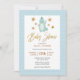 Feiern Sie die bevorstehende Ankunft Ihres wertvollen Babys mit dieser bezaubernden und niedlichen "Baby Shower Invitation" mit einem blauen Dinosaurier glücklich winkend hallo unter den Sternen oben. Der Titel enthält Goldfolie wie Kalligraphie. Der Hintergrund weist pastellblaue Pfeilmuster auf. Sämtliche Texte sind so vorbereitet, dass Sie mit Ihrem Baby Duschdetails einfach und schnell personalisieren können.