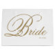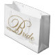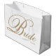 Große Bride Geschenktasche. Elegante goldene Schrift Bride auf weißem Hintergrund mit Hochzeitdatum in klassischem Blocktext unten rechts. Das Hochzeitstermin kann durch Löschen des Textfelds entfernt werden oder durch Hinzufügen von Bräunungs- und Bräutigam-Initialen geändert werden.