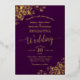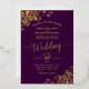 Diese wunderschöne Hochzeitseinladung beinhaltet den Golddruck aus echter Folie auf lila Hintergrund. Das schöne Design hat eine laksige Skriptkalligraphie mit Blumenfiligrane in den Ecken. Stilvoll, elegant, raffiniert und elegant, ist diese Einladung extravagant und glänzend. Die perfekte Wahl für Eleganz, Stil und Klasse.
