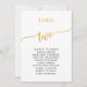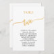 Diese eleganten Tischnummer 2-Sitzkarten eignen sich perfekt für eine Hochzeit. Das neutrale Design besticht durch eine minimalistische Karte, die mit romantischen und skurrilen Imitaten mit Goldfolien-Typografie dekoriert ist. Die Karte druckt auf der Vorder- und Rückseite (beidseitig).