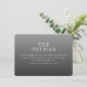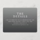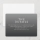 Diese Hochzeitseinlagekarte verfügt über ein minimalistisches Design mit einem Farbverlaufshintergrund, der von hellgrau zu dunkelgrau übergeht und ein elegantes und anspruchsvolles Aussehen schafft. Das Layout ist sauber und gut strukturiert und betont die Text-Hierarchie durch fette Serifenschrift für "DIE DETAILS" und leichtere Serifenschriften für zusätzliche Informationen. Die Graustufenfarbpalette verleiht der Karte eine moderne Note, während sie einen formellen Ton beibehält, der perfekt ist, um wichtige Details klar zu vermitteln. Ideal für Hochzeiten bietet diese Karte eine professionelle und unkomplizierte Möglichkeit, Gäste auf Ihre Website für weitere Informationen zu verweisen.