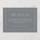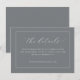 Diese Hochzeitseinlagekarte verfügt über ein minimalistisches und elegantes Design mit einem grauen Hintergrund, der von einem dünnen weißen Rand umrahmt wird. Das Layout ist sauber und betont die Einfachheit durch viel Leerraum um die zentrierten Textelemente. Die Typografie kombiniert eine elegante kursiven Schrift für "die Details" mit einer einfachen serifenlosen Schrift für zusätzliche Informationen und schafft eine anspruchsvolle und dennoch klare Ästhetik. Perfekt für die Übermittlung wesentlicher Ereignisdetails, strahlt diese Karte eine Atmosphäre von Raffinesse und Klarheit aus und ist somit ideal für moderne Hochzeiten, die Organisation und unterschätzte Eleganz schätzen.