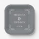 Diese elegante Hochzeitstafel zeigt einen anspruchsvollen, gedämpften grauen Hintergrund mit zarten floralen Eckverzierungen, die den zentralen Text einrahmen. Das Design zeigt einen verfeinerten typografischen Stil, der fette Serifenschrift für die Namen und eine saubere serifenlose Schrift für zusätzliche Details kombiniert und so ein zeitloses und klassisches Aussehen schafft. Perfekt für formelle Anlässe, strahlt dieser Teller eine unterschätzte Eleganz aus und ist ideal, um Ihren besonderen Tag mit einer Note zeitgenössischer Minimalistik zu feiern.