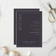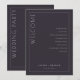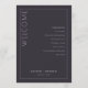 Dieses elegante Hochzeitsprogramm verfügt über ein minimalistisches Design mit dunkelgrauem Hintergrund und moderner, sauberer Typografie. Das Layout ist vertikal ausgerichtet und durch eine dünne weiße Linie in zwei Abschnitte unterteilt: einen für die einladenden Worte "WELCOME" in großer Serifenschrift und einen weiteren, der die Zeremonieereignisse in zentrierter Sans-Serif-Schrift auflistet. Anpassbare Platzhalter ermöglichen eine Personalisierung mit Namen und Daten, wodurch es perfekt für formelle Feiern ist. Die allgemeine Stimmung ist anspruchsvoll und erwartungsvoll, ideal für ein unvergessliches Ereignis.