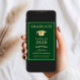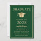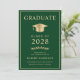 Elegante Ankündigung und Party Einladung eines grünen Uni-Abschlusses mit einer Goldabschlusskappe und moderner Goldtypografie für den Namen, das Klassenzjahr, die Uni oder die Universität, den Abschluss und die Hauptfach- oder Ehrendoktor. Fügen Sie auf der Rückseite die Details zum Abschluss hinzu.