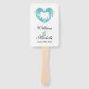 Elegantes Hochzeitsprogramm am Strand Herz Hand Fan . Fügen Sie Ihre eigene personalisierte Trauung Zeremonie Reiseroute Zeitplan. Klassische Schrift Typografie Vorlage für Ehepaare zu heiraten. Türkisblau und weiß oder Farbe nach Maß. Personalisieren Sie mit Name und Bestellung. Vintages Herz mit Silhouette aus Palmen. Ideal für Sommer oder Hochzeit in Urlaubsort in tropischem Klima.