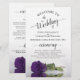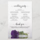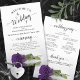 Diese Hochzeitsprogramme sind elegant und geschmackvoll, aber dennoch preisgünstig. Die Einrichtung besteht aus einem Single, der lang und tief in die königliche lila Rose eingebettet ist und in einem Wasserbecken mit Wellen und Wellen reflektiert wird. Die Typografie zeigt eine laky schwarze Schriftzeichen-Kalligraphie, und es gibt Raum für Details über die Zeremonie, das Brautparty, und ein kurzes Dankeschön.