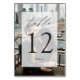 Elegante moderne Hochzeitskarten verfügen über ein vollflächiges, vertikales Foto mit einer Tischnummer, die auf einem rechteckigen, weißen Element mit schick kalligraphischem Schriftzeichen überlagert ist. Personalisieren Sie mit Ihren Initialen und Hochzeitsdatum am Ende.