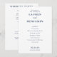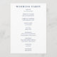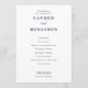 Dies ist ein Bild im minimalistischen Stil mit einem eleganten Hochzeitszeremonie-Programm für die Vereinigung von Lauren und Benjamin. Das Design verwendet eine saubere, klassische Schrift in Navyblau auf weißem Hintergrund, die Eleganz und zeitlose Schönheit ausstrahlt. Es listet die Abfolge der Ereignisse während der Zeremonie mit Präzision und Anmut auf, einschließlich des Prozessionsmarschs, des Austauschs der Gelübde, der Einheitzeremonie und mehr. Perfekt für Paare, die zurückhaltende Eleganz schätzen und ihren Gästen ein raffiniertes Erinnerungsstück bieten möchten.