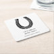 Elegante klassische Schwarz-weiße Pferderennen Derby Party Papier Untersetzer mit einer Vintagen Horseshoe Illustration. Alle Textelemente können so geändert werden, dass dieses Design auch für andere Reitveranstaltungen verwendet werden kann. Verwenden Sie das Entwurfstool, um die Bild- und Textelemente zu skalieren oder den Schriftart zu ändern.