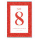 Diese elegante Hochzeitstischkarte zeigt eine markante, korallenfarbene "8" auf einem sauberen weißen Hintergrund, umgeben von komplizierten, blattähnlichen Mustern in einem passenden roten Farbton. Das Design kombiniert modernen Minimalismus mit subtiler Raffinesse, indem es klare Linien und satte Farben für einen gepflegten Look verwendet. Eine elegante Schreibschrifttypografie verleiht oberhalb der Zahl einen eleganten Touch, während einfache serifenlose Schriften für Klarheit bei den anpassbaren Details darunter sorgen. Perfekt, um Ihrem Hochhempfang einen chic und zeitgenössischen Touch zu verleihen, ist diese Karte darauf ausgelegt, eine Atmosphäre von unterschätztem Luxus zu schaffen.