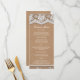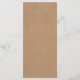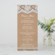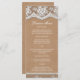 Elegantes Lace & Rustic Kunsthandwerk Slim Wedding Rezeption Dinner Menü. Delikates Spitzendesign auf weichbraunem Papier. Auf dieser Einladung wird kein wirkliches Papier oder Papier verwendet, die Spitzen- und Textureffekte werden gedruckt.