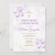 Elegantes Lila- und Goldkreuz Erste Heilige Kommunion Einladung Primera Comunión