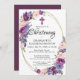 Eine lila, staubige Pflaume mit schönen rosa Rosenakzenten. Viel Grün, Blätter und Weinreben behielt ihn offen und luftig. Die Weihnachtsfeier ist in einer fließenden Schrift geschrieben. Der Name des Mädchens ist in klassischer Serifenschrift geschrieben. Die Rückseite der Einladung ist ein tiefes lila. Diese hübsche Taufvorlage ist sehr einfach zu personalisieren.