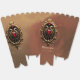 Elegantes luxuriöses Herzemblem. Das Design besticht durch einen verzierten, gewölbten Rahmen mit glänzendem braunem Hintergrund. Der Rahmen ist sehr detailliert mit barocken Schnörkeln. Von der Spitze des Bogens hängen zarte goldene Ketten mit Teardrop Anhängern. In der unteren Mitte zeigt ein kleinerer, ähnlich gestalteter goldener Rahmen ein rotes Herzemblem, flankiert von geflügelten Schlangen. Die Stimmung ist luxuriös und dekorativ.