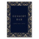 Dieses elegante Hochzeitstisch-Schild verfügt über einen ausgeklügelten, dunkelblauen Hintergrund, der von aufwendigen, goldenen Blumenmustern umrahmt wird und eine luxuriöse und einladende Atmosphäre schafft. Das Design umfasst eine klassische Serifenschrift, die "DESSERT BAR" und "PLEASE TAKE A TREAT!" in Großbuchstaben anzeigt und den formalen, aber warmen Ton des Stücks unterstreicht. Perfekt zur Verbesserung der Atmosphäre an Ihrem besonderen Ereignis, kombiniert dieses Schild traditionelle Damast-Motive mit moderner Klarheit und ist somit ideal für jede Gelegenheit, bei der ein Hauch von Eleganz gewünscht wird.