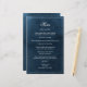 Elegantes und elegantes Hochzeitsdesign. Navy blaues Aquarellpapier. Weiße Schrift. Elegante Schriftart-Kombination. Hochzeitsmonogramm: Klassischer Lorbeerkranz mit den Initialen von Braut und Bräutigam. Ideal für Hochzeiten am Strand, Hochzeiten am Meer, Hochzeiten an der Küste oder Hochzeiten am Meer. Blau-weiße Farbe, schlichtes elegantes Design machen es zu einer großartigen Wahl für eine klassische, halbformale Hochzeit.