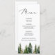 Elegantes Minimalistisches Waldhochzeitmenü mit passenden Gegenständen. Karo der Sammlung.