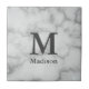 Die Kachel der Keramik hat ein hübsches, weißes Marmormuster aus Imitaten. Es gibt ein großes dunkelgraues Monogramm über dem Bildschirmtext, das bearbeitet werden kann, um benutzerdefinierten Text wie einen Namen hinzuzufügen.