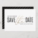Elegante moderne Ankündigung Datum freihalten in Schwarz und Gold. Mit klassischem Gold-Effekt-Skript-Text und modernem Stripe-Backer-Design. Teil einer Sammlung.