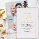 Diese stilvolle Hochzeitseinladung enthält Namen und Rahmen in Goldfolie auf weißem Hintergrund. Das Design verbindet eleganten Skript- und Serifentext und bietet ein Foto auf der Rückseite.