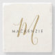 Eleganter, moderner Untersetzer für Monogramm-Stone mit weißem Script. Ein elegantes Goldskriptmonogramm kombiniert mit einem sauberen schwarzen San-Serif-Schriftart verleiht dem Ganzen einen zeitgemäßen Look.