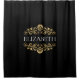 Ein eleganter, schwarz-goldfarbener Duschvorhang blüht Monogramm. Fügen Sie Ihren Namen zwischen den goldenen Blüten auf der Vorderseite geblüht. Entworfen für Sie von BlackBerry Boulevard.