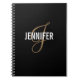 Elegantes schwarzes Notizbuch mit einem goldenen Schriftzeichen und einem weißen Namen. Personalisieren Sie mit Ihrem Namen und Initial.