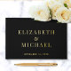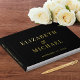 Elegantes schwarzes Hochzeitsgast-Buch mit Ihren Namen in großen klassischen Serifentypografie, mit Monogramm in Ihrer Wahl von echter Gold, Silber oder Rose Goldfolie, und Ihrem Hochzeitstag. Personalisieren Sie mit Ihrem Foto auf der Rückseite und einem benutzerdefinierten Titel auf der Wirbelsäule.