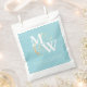 Elegante Monogram Gold Sea Glass Aquamarine White Gastgeschenk Hochzeit Bag. Personalisieren Sie mit Ihren Bride & Groom Monogramm-Initialen, Braut- und Bräutigam-Namen, Hochzeitstag in Weiß über blauem, aquamarinem Meeresglas-Quadrat. Wir laden Sie ein, unser Zazzle Geschäft, Beachy Design Co, zu besuchen, um die komplette Hochzeitssuite zu sehen. Bitte kontaktieren Sie uns, wenn Sie Hilfe benötigen.