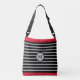 Modernes, elegantes Monogramm auf schwarz, rot und silberfarben gestreift Crossbody Bag. Mein Brief kann personalisiert sein.