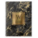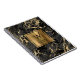 Ein elegantes Notizbuch mit einem Hintergrundbild aus schwarzem Marmor mit goldenen Adern. Personalisieren Sie es mit Ihrem Monogramm Initial in dekorativem Schriftart und Ihrem Namen in Kupferprägung auf einem bürstenbehafteten goldenen Quadrat.