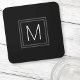 Untersetzer mit einem Monogramm, das zunächst in Weiß in einem quadratischen, dunkelgrauen Doppelrand auf schwarzem Hintergrund erscheint.
