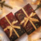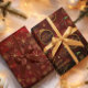 Wunderschönes Personalisiertes WeihnachtsweihnachtspAPIER auf einem roten Hintergrund mit schwarzen Farbtönen und einem eleganten, vergoldeten Muster mit kleinen Blume, Sternen, Weihnachtsbäumen und Bälle. Diese eignen sich hervorragend, um Ihre Geschenke zu verpacken und ihnen etwas Eleganz zu verleihen. Sie können den gesamten Text aktualisieren, den Familiennamen ändern oder einen Namen eines Paares oder eines Unternehmens im ersten Blatt verwenden.