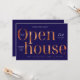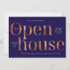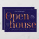 Mit diesem eleganten marineblauen und bronzefarbenen Effekt bietet das Open House Einladung moderne Business-Einladungen für Ihr echtes Anwesen oder ein offenes Haus. Diese berufliche Sale-Event-Einladung enthält ein minimales Layout mit fett formatierten Serif-Schriftart und Platz für Ihr Logo und benutzerdefinierte Veranstaltungsdetails.