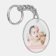 Trendy, klassisch personalisierter Schlüsselanhänger für ein kleines Mädchen mit einem weißen Rahmen mit einer runden Öffnung für ein maßgeschneidertes horizontales Foto, und eine abgerundete rosa Band auf jeder Seite, auf der der Name oder die Namen des Mädchens und ihr Geburtsdatum in einem eleganten Drehbuch Schriftart / Typografie. Beachten Sie, dass Sie wählen können, um diesen Schlüsselanhänger Single-seitig zu kaufen.