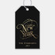 Moderne schwarze Geschenkanhänger mit "Happy New Year" in einem eleganten goldenen Kalligraphie-Skript. Personalisieren Sie mit Ihrem Namen und dem Jahr.