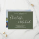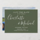Diese elegante olivengrüne Save the Date-Karte mit ihren charakteristischen Stilnamen kann mit Ihren besonderen Informationen zum Hochzeitstag in schicker Typografie und Ihrem besonderen Foto auf der Rückseite personalisiert werden. Entwickelt von Thisisnotme©