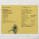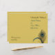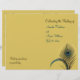 Elegante Pfauenfedern betonen dieses Hochzeitsprogramm auf einem hellen, gelben Hintergrund. Es ist auf dem leichtgewichtigen Papier gedruckt, sodass es leicht zu falten ist.