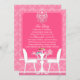 © 2013 Sozialite Designs. Eine elegante Tee-Party Einladung mit antikem Tischdesign, Damast-Tapeten, Tee mit Kuchen und Kronleuchter in Rosa und Weiß. Personalisieren Sie diese Einladung mit Ihrem eigenen Text für jede Tee-Party-Veranstaltung. Fügen Sie Ihre eigene persönliche Touch hinzu, indem Sie Verzierungen wie Bänder, Nashörner oder Blume auf Papier hinzufügen.